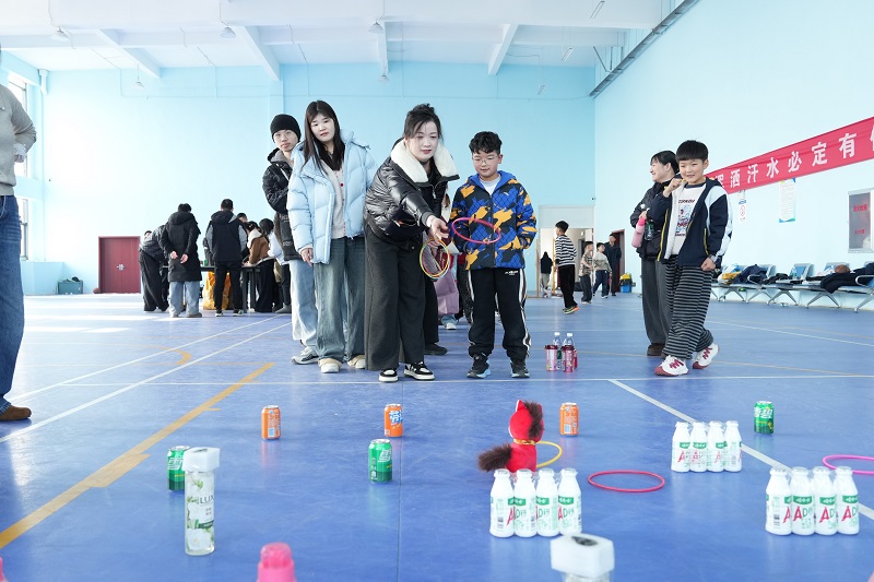 套圈贏年貨活動,各種飲料、布偶小馬等豐厚獎品整齊擺放,員工及家屬們手持套圈、瞄準目標、輕輕一拋,期待著幸運降臨,套中獎品的員工喜笑顏開,滿載而歸。